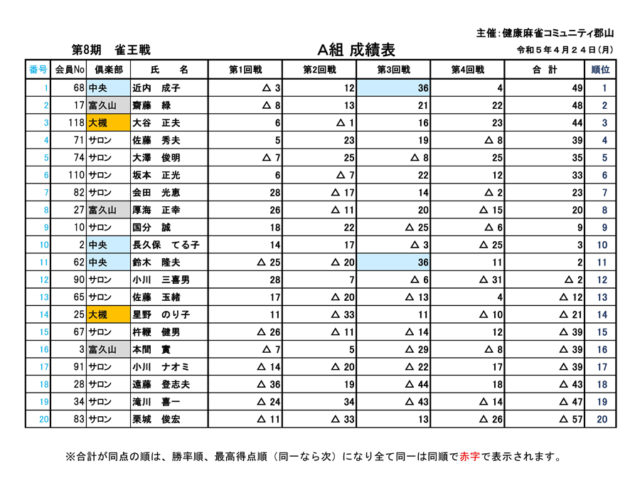 令和5年4月第8期雀王戦大会結果