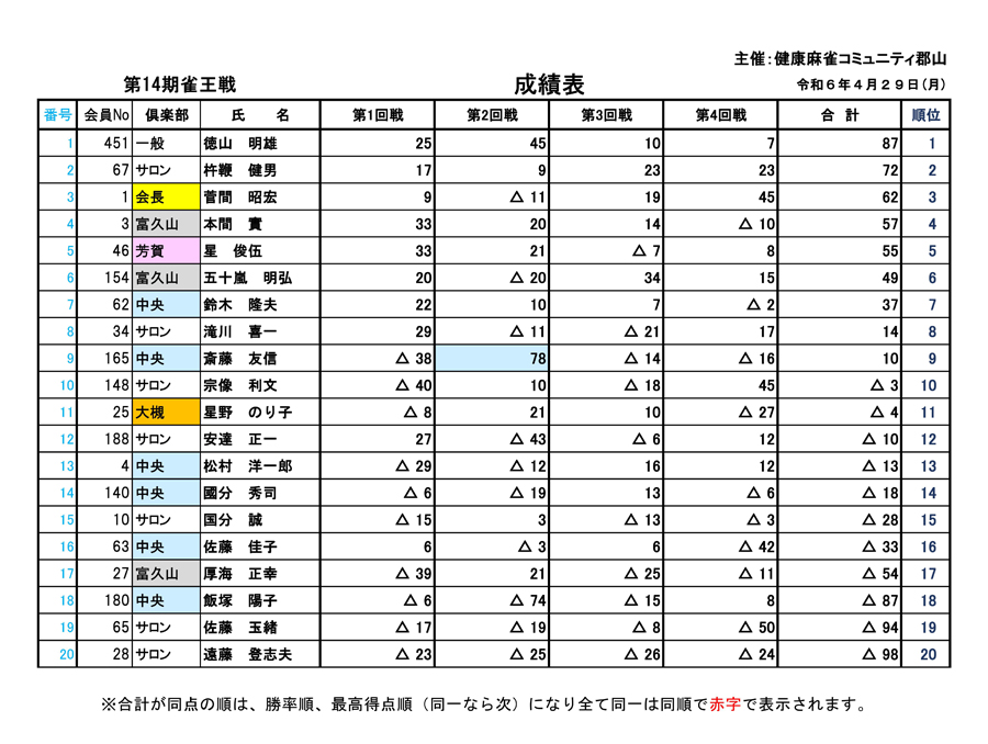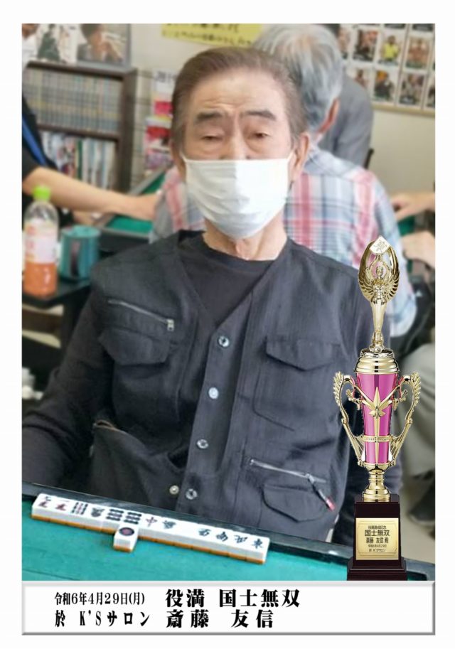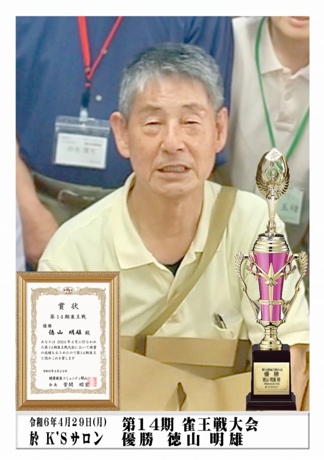 令和6年4月第14期雀王戦大会結果 令和6年4月29日(月)K’Sサロンで10:00から第14期雀王戦大会が開催されました。 5卓20名で競技を行ないました。 競技会で斎藤友信さんが役満国士無双を和了しました。おめでとうございます! 優勝は一般参加の徳山明雄さんです。おめでとうございます! 〇役満国士無双和了 斎藤 友信さん おめでとうございます! 〇成績表 〇優勝 徳山 明雄さん おめでとうございます! 〇記念集合写真 次の大会もよろしくお願いします。