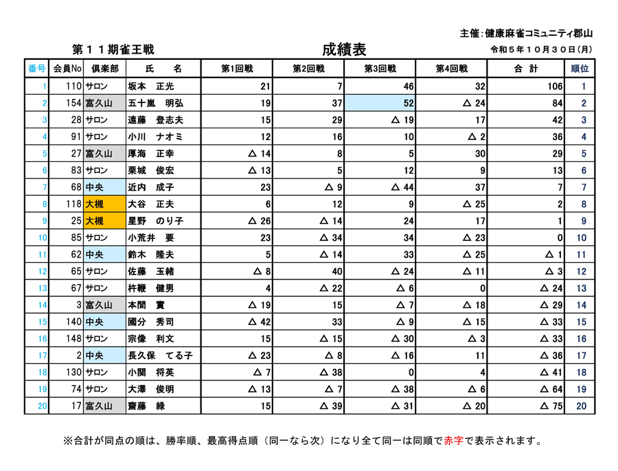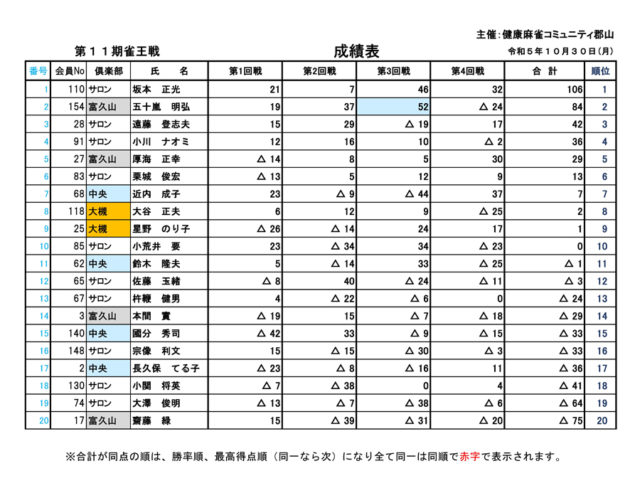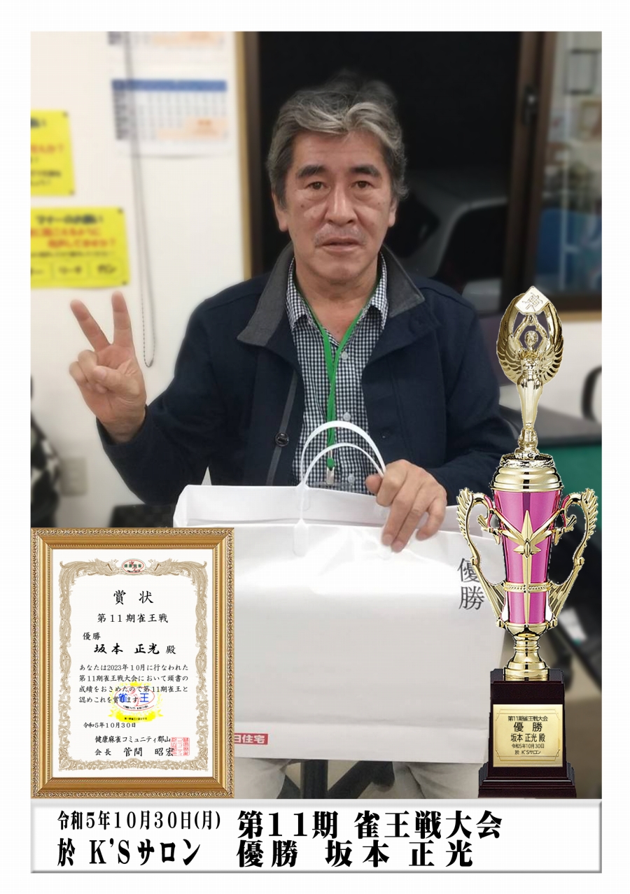 令和5年10月30日(月)K’Sサロンで10:00から第11期雀王戦大会が開催されました。