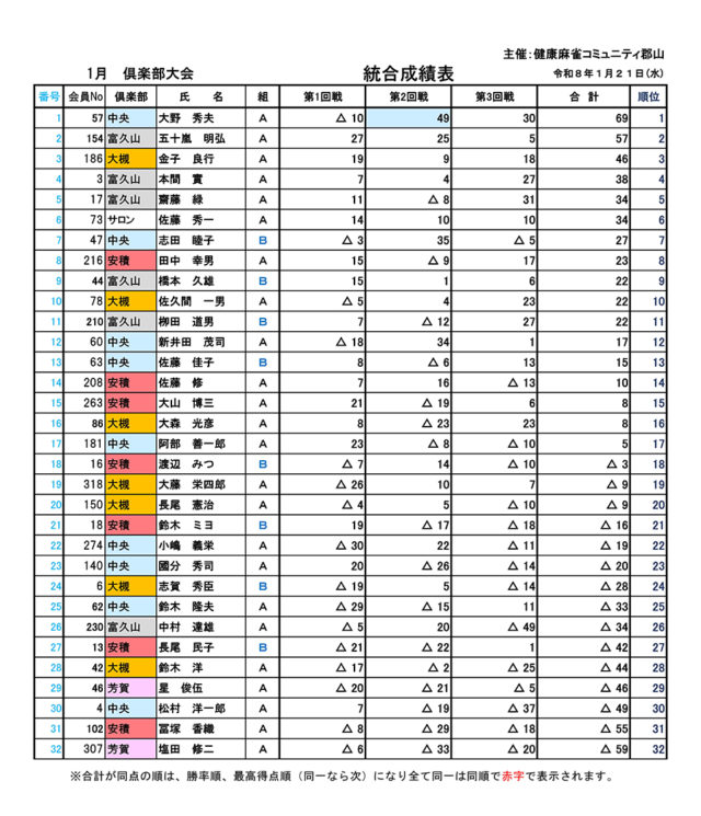 令和8年1月21日(水)安積公民館安積分室で13:00から倶楽部1月大会が開催されました。