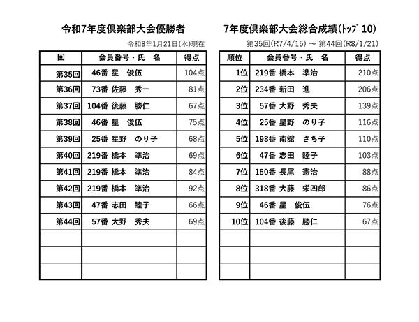 最初に本年度の各回優勝者とトップ10の表を掲載しています。