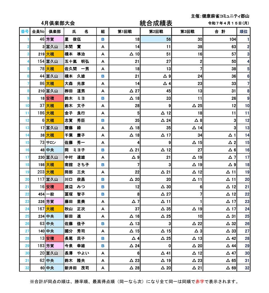 令和7年4月15日(火)公会堂で13:00から倶楽部4月大会が開催されました。