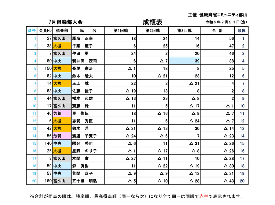令和5年7月倶楽部大会結果
