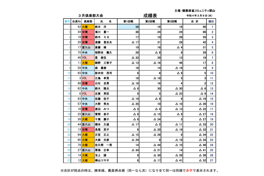 27名の参加で、会長等が入り7卓28名での競技となりました。