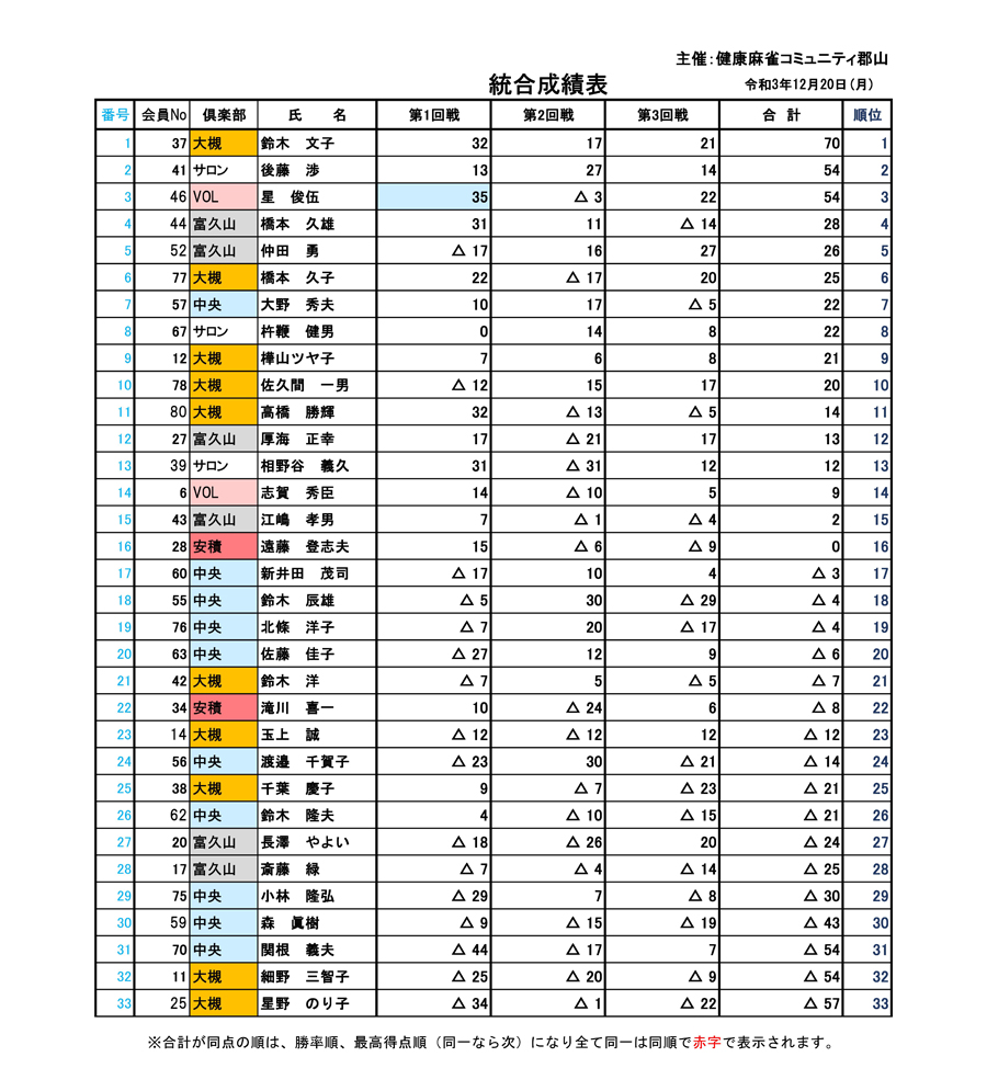 成績に関係するのは33名で、鈴木文子さんが優勝しました。おめでとうございます!