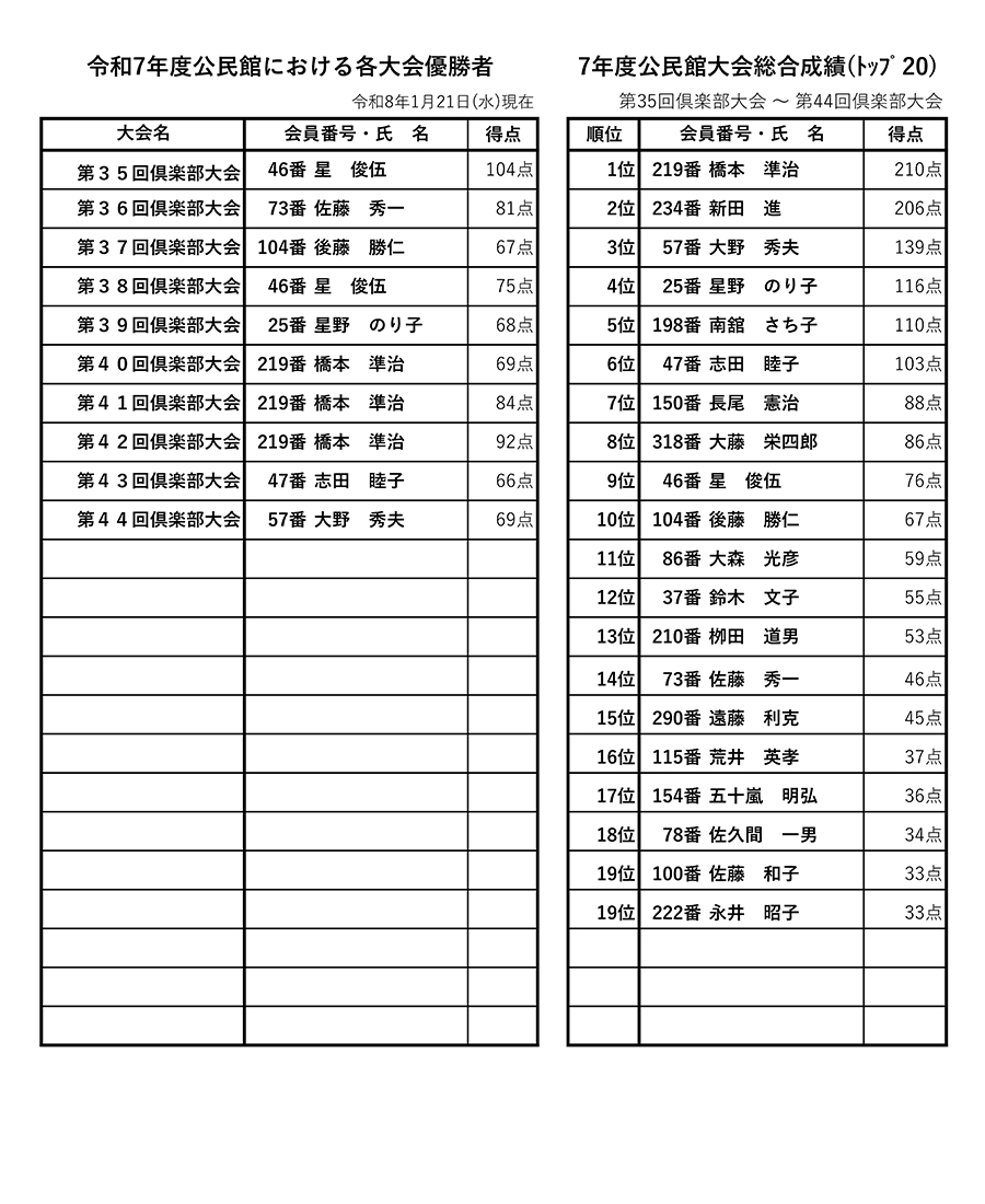 左側は各大会の優勝者、右側は年度のトップ20です。
