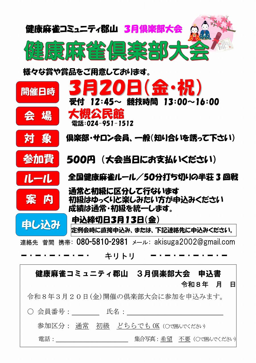 令和8年3月20日(金・祝)13:00~16:30 大槻公民館で3月倶楽部大会を開催します。