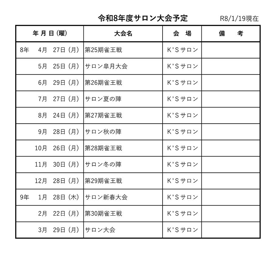 予定は変更する可能性があります。変更の際はサロン大会予定表を更新します。