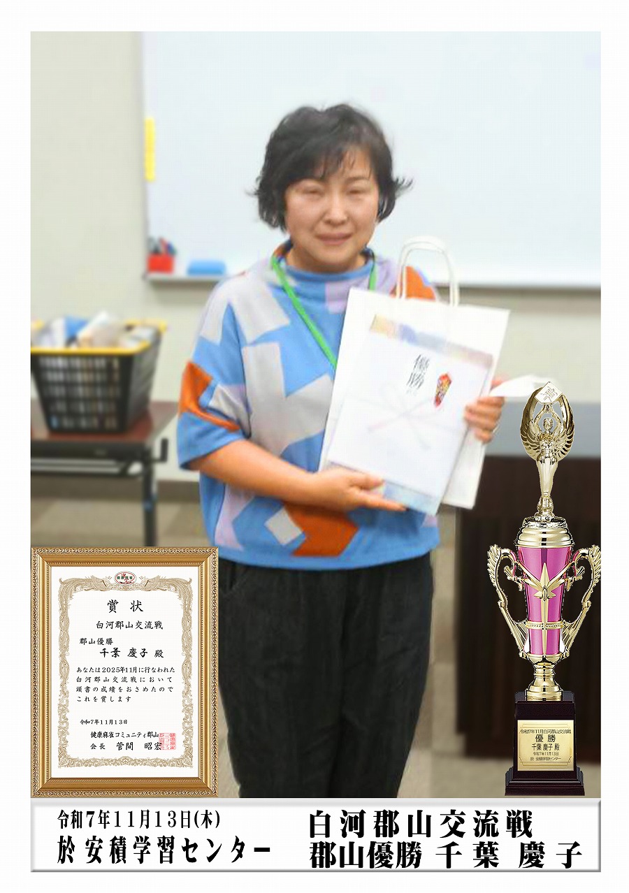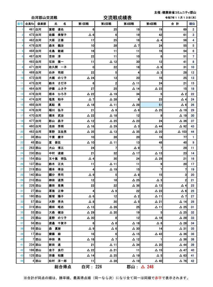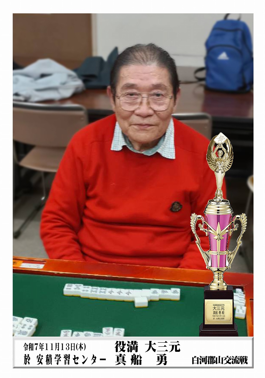 令和7年11月白河郡山交流戦結果 令和7年11月13日(木)安積学習センターで10:00から白河郡山交流戦が開催されました。 11卓44名で競技を行ない、白河雀健倶楽部の優勝は富樫達也さん、健康麻雀コミュニティ郡山の優勝は千葉慶子さんでした。 おめでとうございます! この交流戦で白河雀健倶楽部の真船勇さんが役満大三元を和了しました。 おめでとうございます! 〇交流戦会場の様子 〇各卓の様子 〇役満大三元和了 真船勇さん おめでとうございます! 〇成績表 〇郡山優勝 千葉慶子さん おめでとうございます! 〇白河優勝 富樫達也さん おめでとうございます! 〇皆さん各賞をいただきました。 おめでとうございます! 〇記念集合写真 次回もよろしくお願いします。