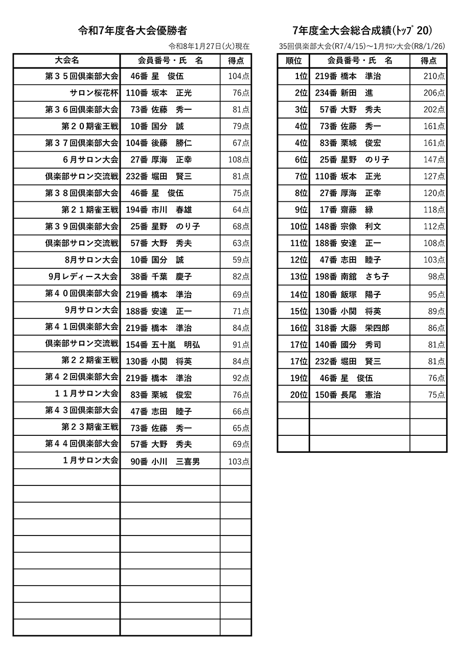 〇令和6年度の各大会優勝者及び大会全体トップ20