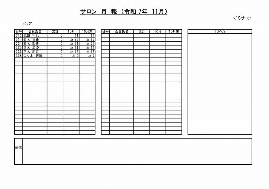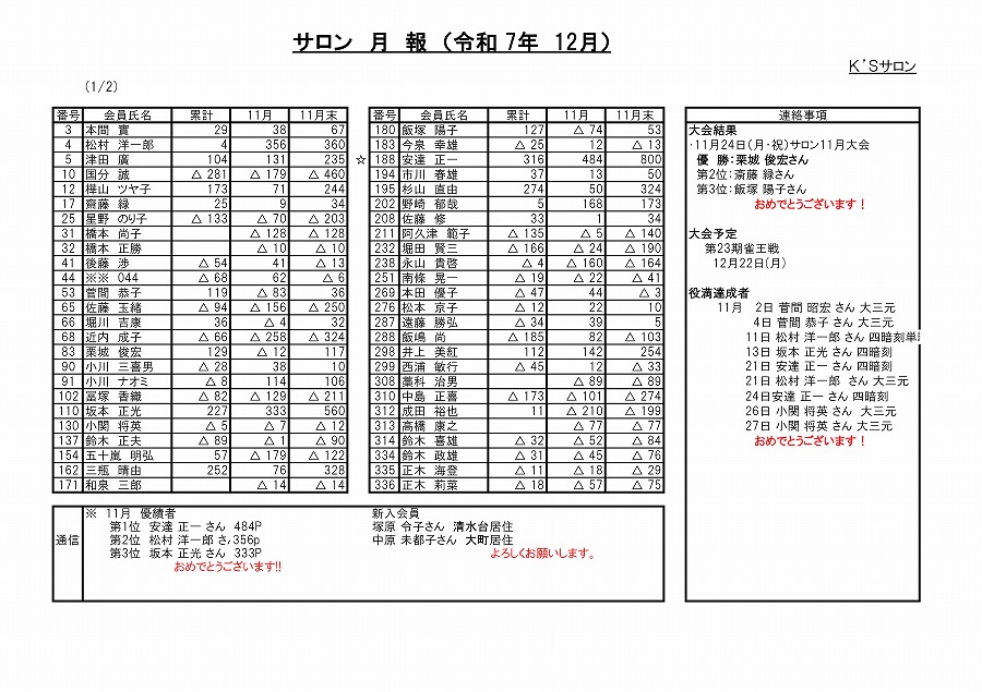 場所:郡山市安積町荒井田中屋敷12 電話:080-5810-2981(担当:菅間) 定休日:月曜日 開催時間:10:00~18:00 入会金:1,000円 月会費:500円(倶楽部会員は免除) 実技講習の他、毎月大会を行なっています。 ・大会の案内はイベント予定ページで確認してください。 ・大会の結果はイベント報告ページで確認してください。 備考:お気軽にお立ち寄りください。見学自由、無料体験有り。 サロン月報は、前の月にサロン活動に参加した会員の方が表示されます。 今月の入会者は来月の月報から掲載されます。 月末得点は半期毎の累積が表示されます。
