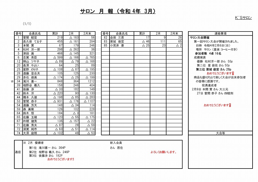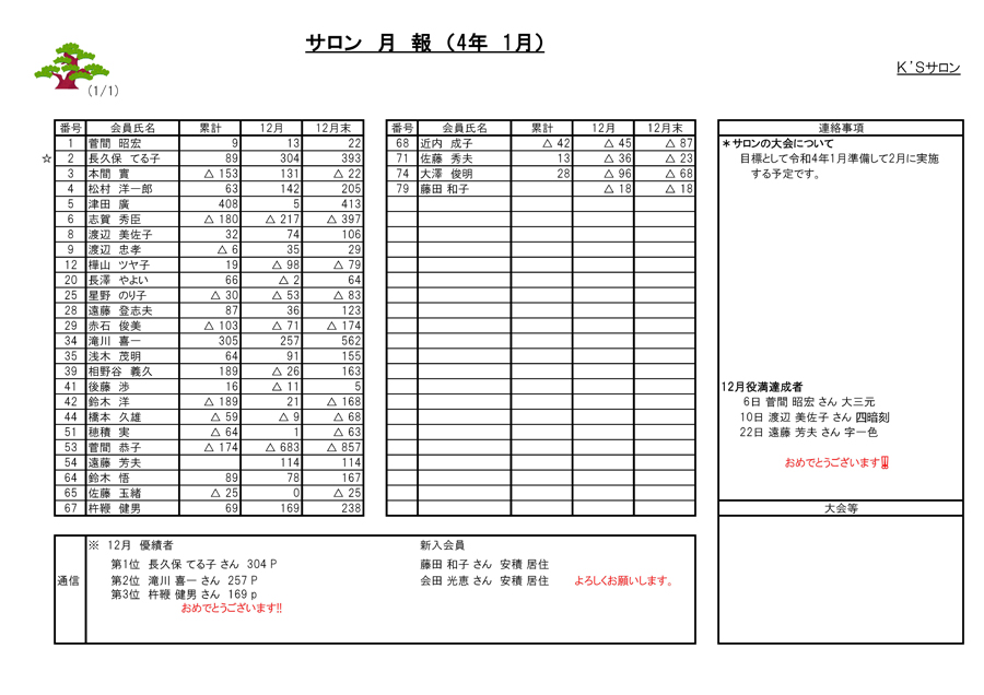 なお、月末得点は半期毎の累積が表示されます。今月の入会者は来月の月報から掲載されます。