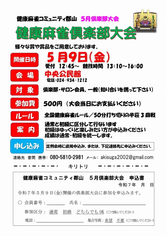 令和7年5月9日(金)13:00~16:30 中央公民館で5月倶楽部大会を開催します。