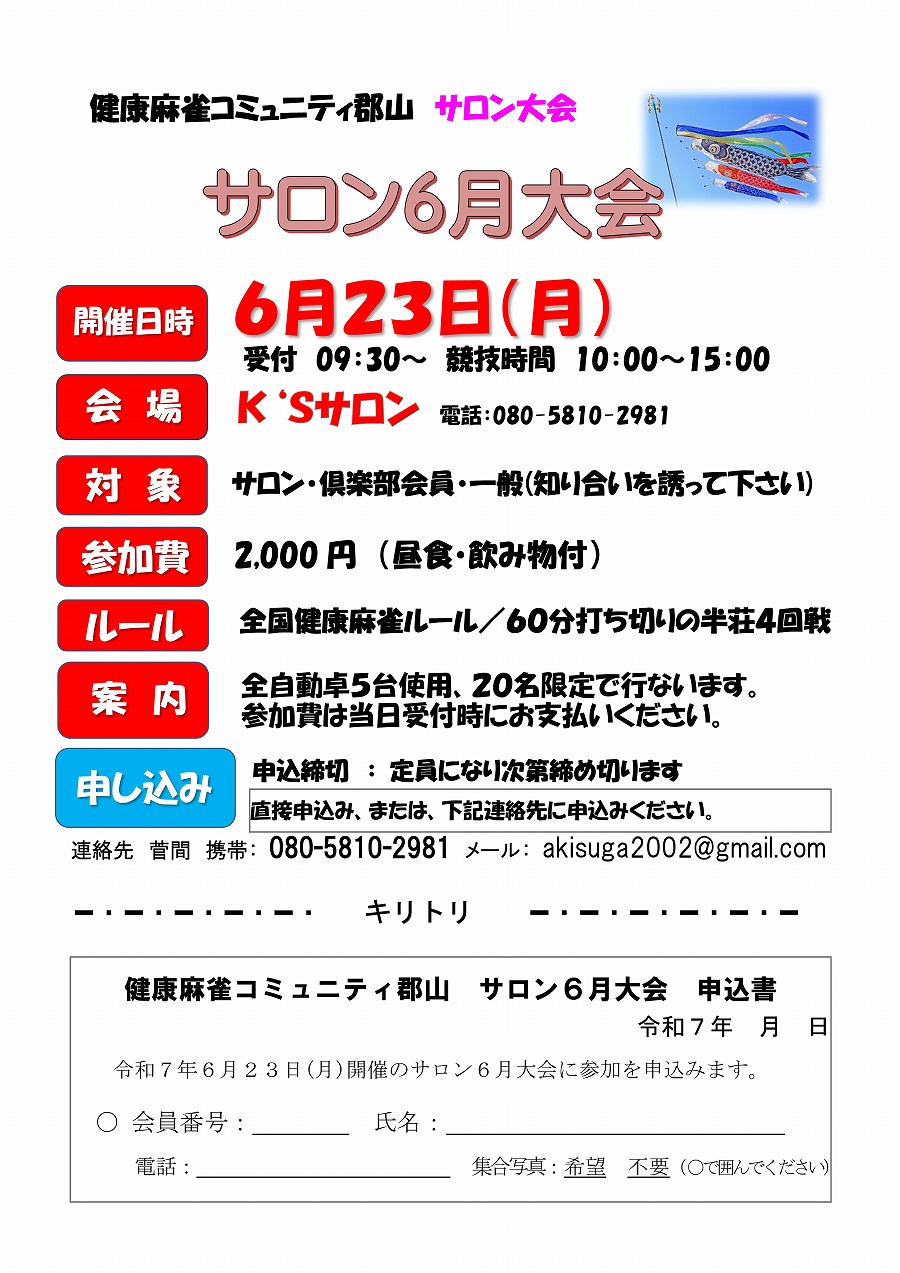 令和7年6月23日(月)10:00~16:00 サロンで令和7年6月大会を開催します。