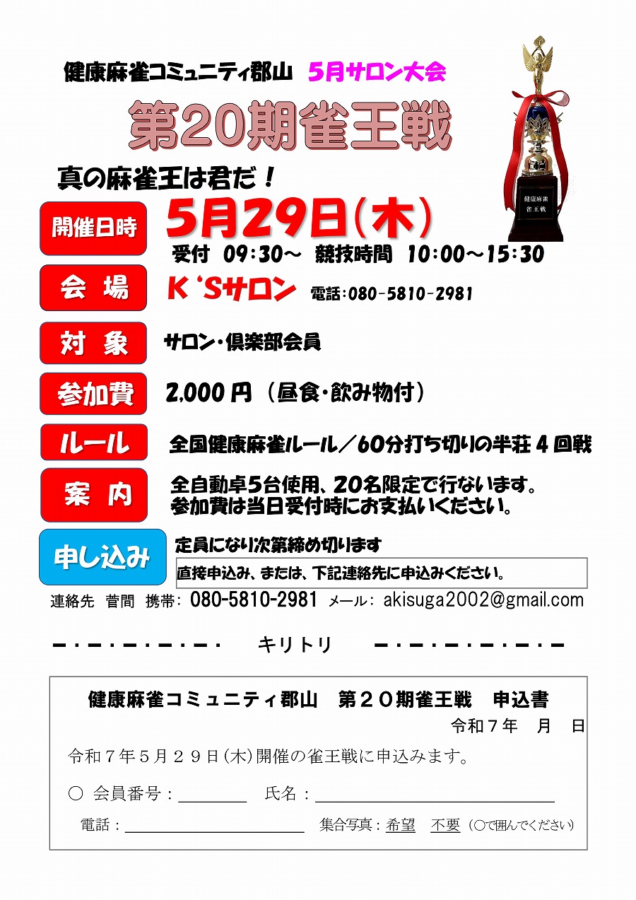 令和7年5月29日(木)10:00~15:30 サロンで第20期雀王戦大会を開催します。