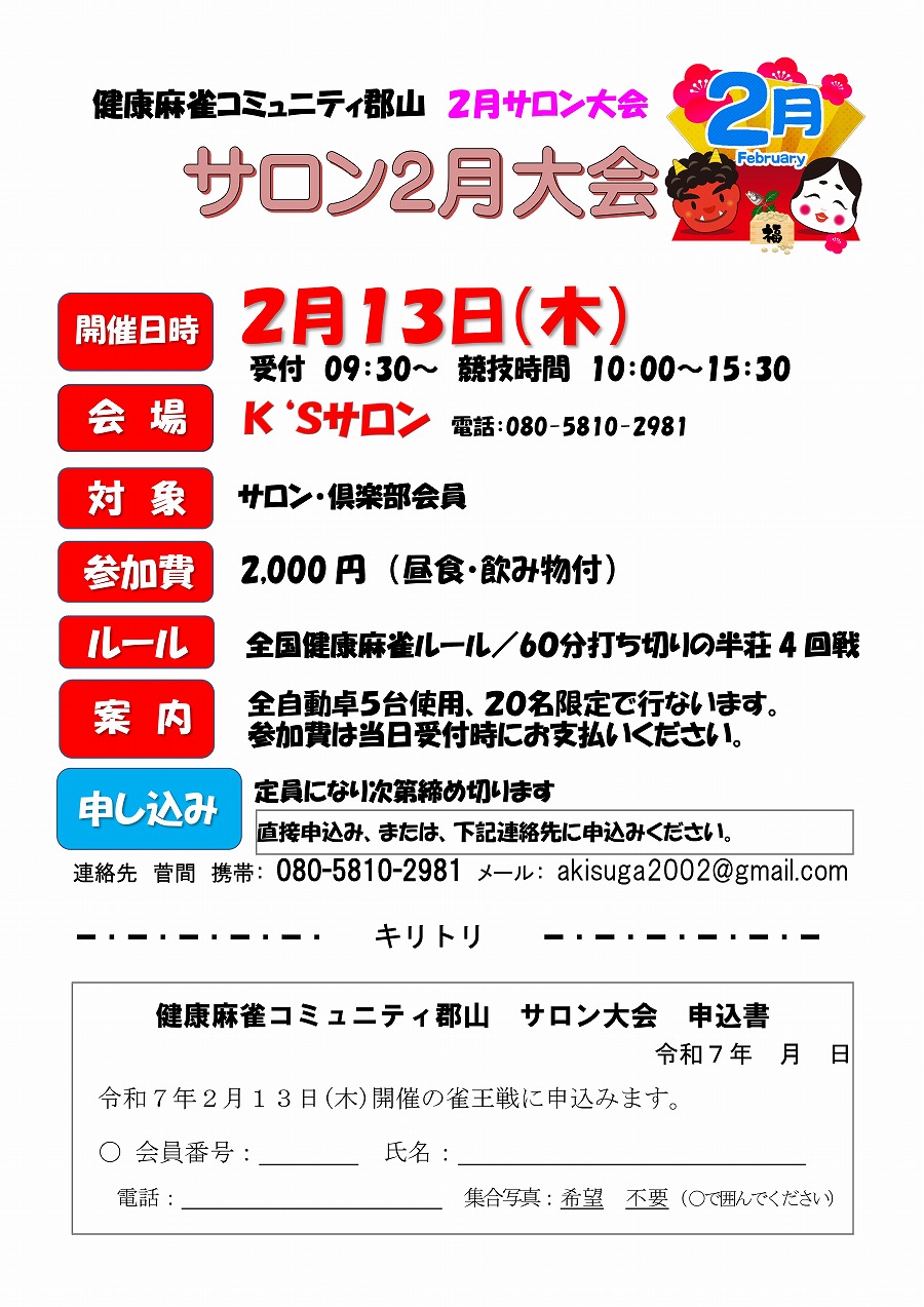 令和7年2月13日(木)10:00~16:00 サロンで令和7年2月大会を開催します。