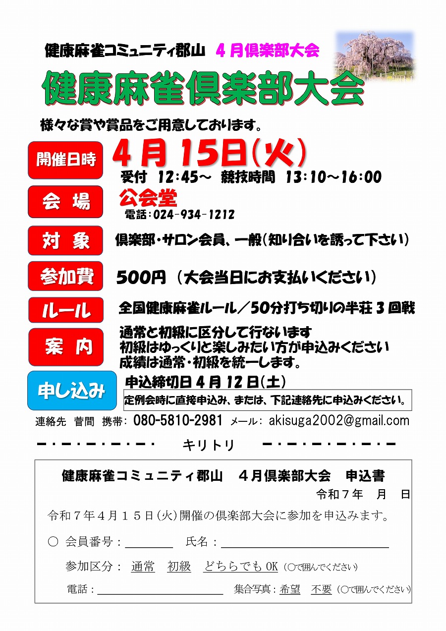 令和7年4月28日(月)10:00~16:00 サロンで令和7年4月大会を開催します。