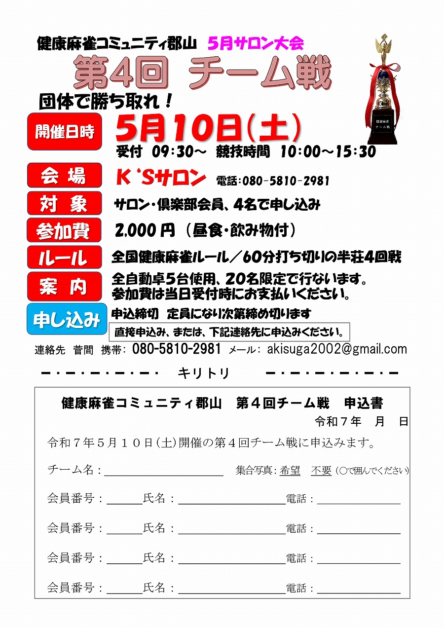令和7年5月10日(土)10:00~15:30 サロンで第4回チーム戦を開催します。