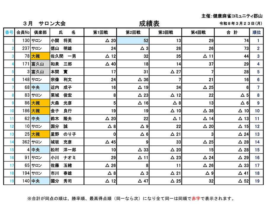 令和8年3月23日(月)K’Sサロンで10:00からサロン3月大会が開催されました。