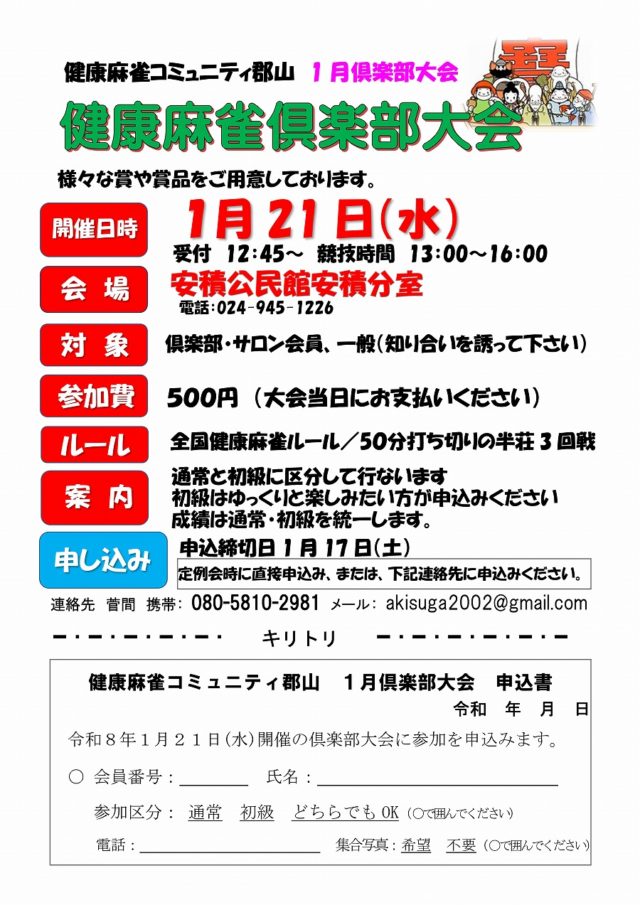 令和8年1月21日(水)13:00~16:30 安積公民館安積分室で1月倶楽部大会を開催します。
