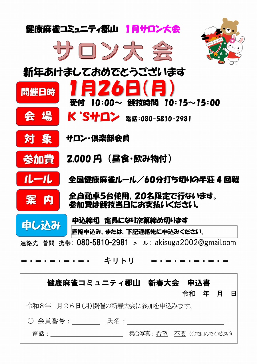 令和8年1月26日(月)10:00~16:00 サロンで令和8年1月大会を開催します。