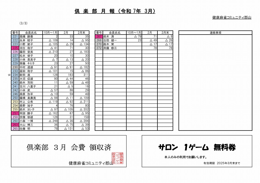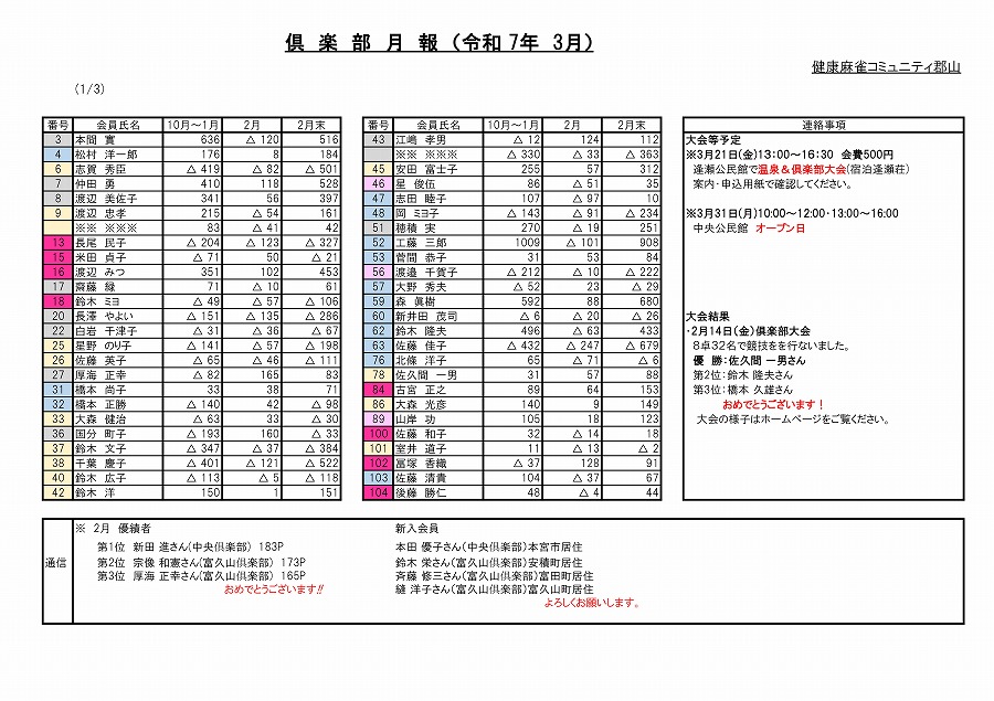 なお、月末得点は年度の累積が表示されます。今月の入会者は来月の月報から掲載されます。